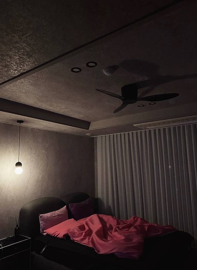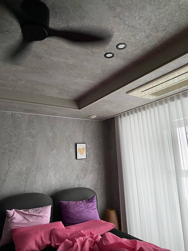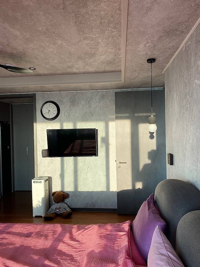 거실과는 다르게 벽지를 하고 싶었고 다른 느낌을 주고 싶어서 안방 벽지를 고르는데 가장 고민도 많이 하고 힘들었어요. Lx 하우시스 자이언트 스톤 그레이로 천장까지 전체 벽지 마감을 했어요. 멋스러운 침실 공간으로 대만족입니다. 다소 그레이 컬러로 차가워 보일 수 있어서 침구는 핫핑크로 유니크함을 더했어요. 살짝 블랙과 퍼플, 연핑크도 한 스푼씩 넣었어요.