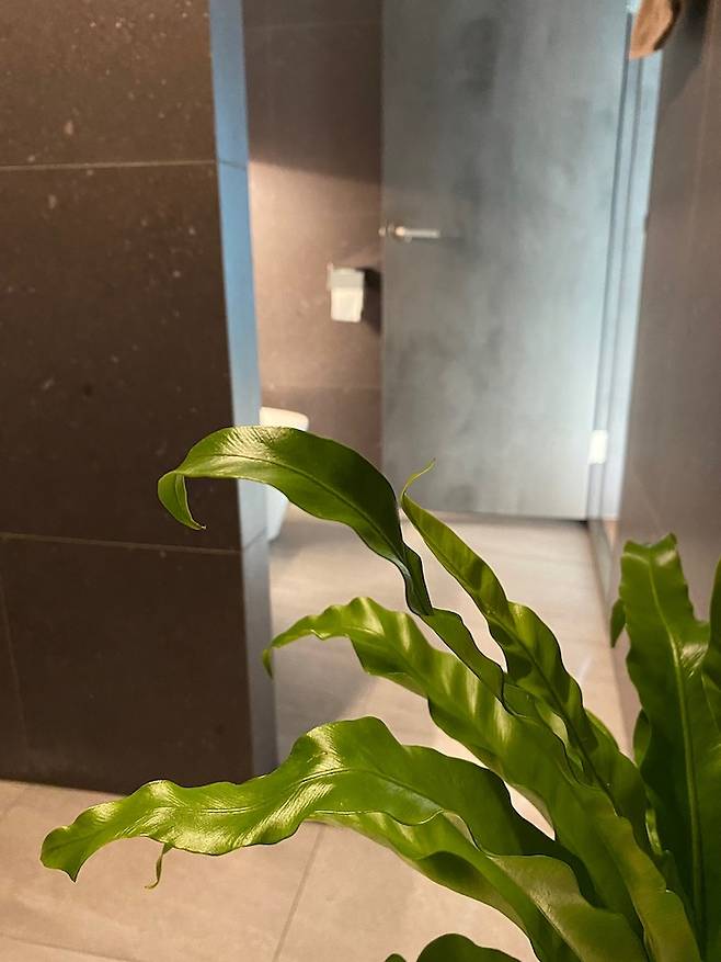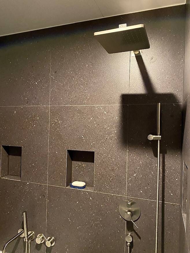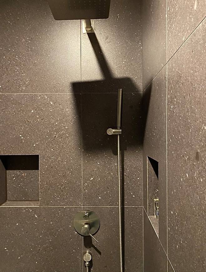 600각 다크 그레이 포세린 타일과 샴푸박스가 한층 화장실을 돋보이게 하네요.