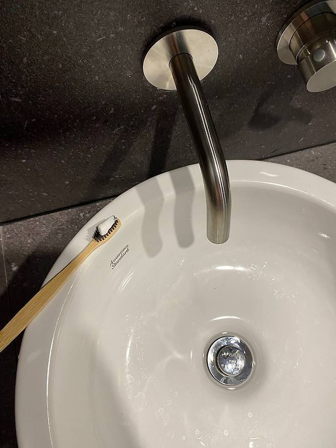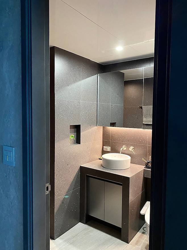 호텔 화장실로 꾸민 안방 화장실이에요. 현 사진은 조명 없이 아침 햇살을 살짝쿵 받았을 때 찍은 사진이에요. 짙은 그레이 타일과 매립 수전, 탑볼 세면대로 톤앤톤으로 갖추어진 호텔식 화장실을 표현했어요. 그레이 포세린 타일과 탑볼 세면대로 여느 호텔 화장실이 부럽지가 않아요. 졸리컷 마감까지 해서 더 고급져진 것 같아요.