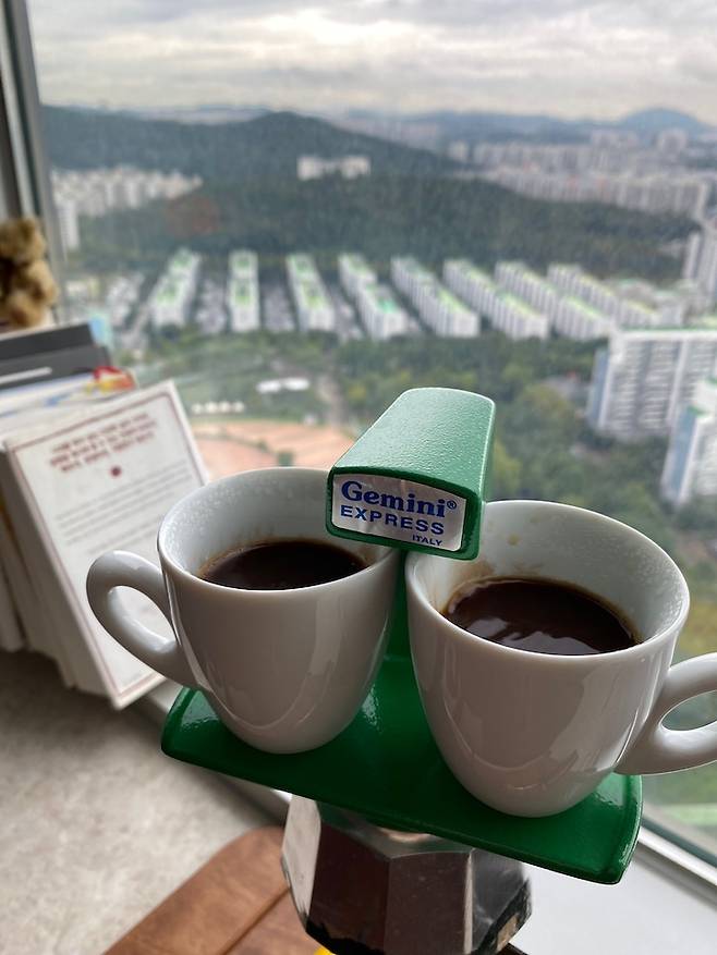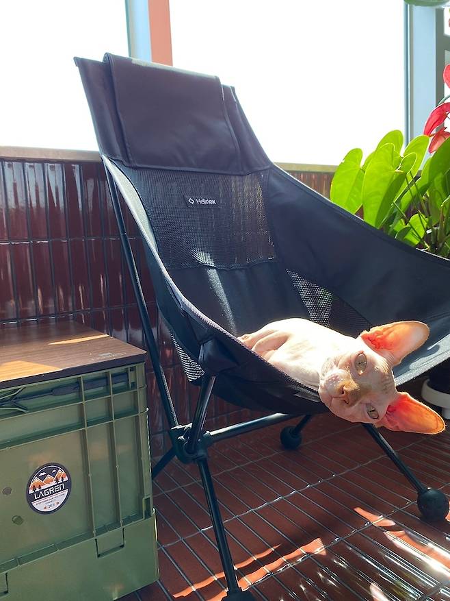 안방 베란다는 동쪽이라서 햇살과 조망이 너무 좋은 공간이에요. 집 앞에 공원 뷰, 산 뷰 좋아요. 브런치도 먹고, 모카포트에 커피도 내려서 책도 읽고 여유로운 공간이죠. 울 치미도 캠핑 의자에 누워 일광욕을 좋아해요.