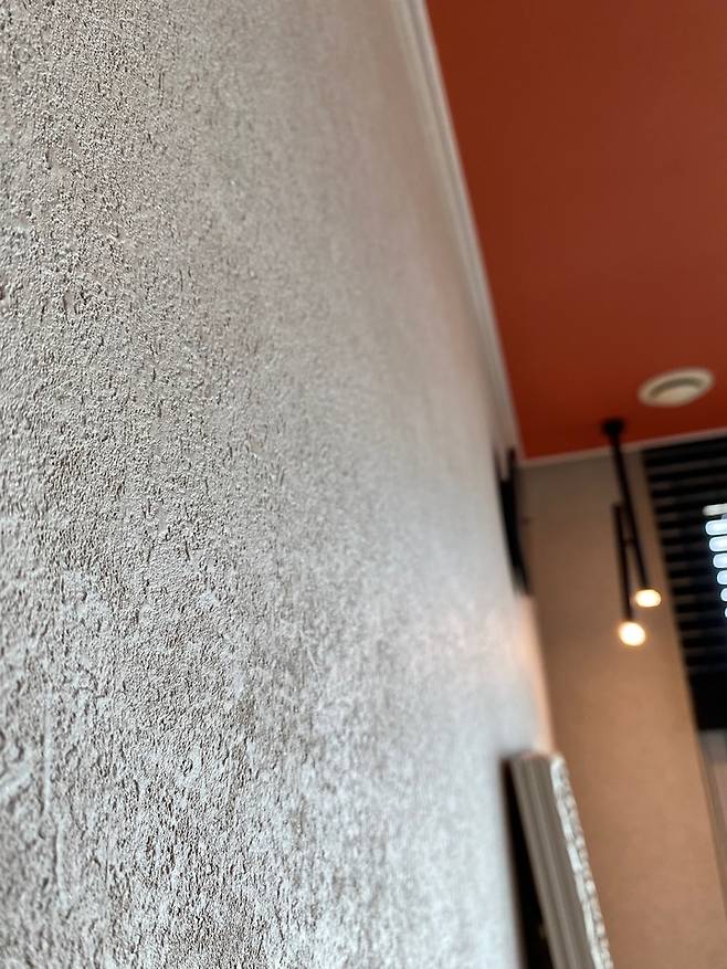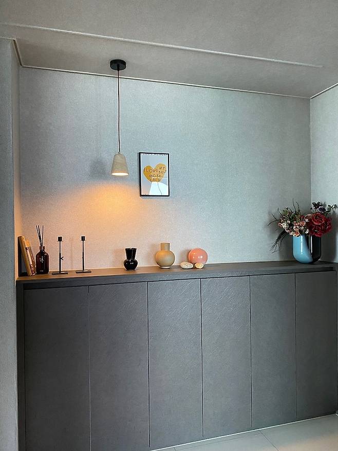 Lx하우시스 디아망 회벽 시리즈 라이트 그레이로 전체 마감했어요. 전체 디아망 안 했으면 후회했을 것 같아요. 살짝 차가운 회벽 느낌이여서 가구나 액자, 오브제 등으로 컬러 포인트를 주었어요.