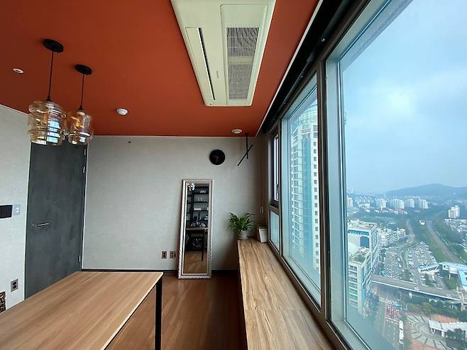 탁 트인 조망으로 비가 와서 비 멍도 좋고, 하늘 보기도 좋고, 공원 뷰와 산 뷰가 있어 힐링되는 공간이에요. 남편이 윈도우 시트는 참 잘했다고 칭찬을 해주었어요. 3분 거리에 전철역이 있어서 초 역세권이에요.