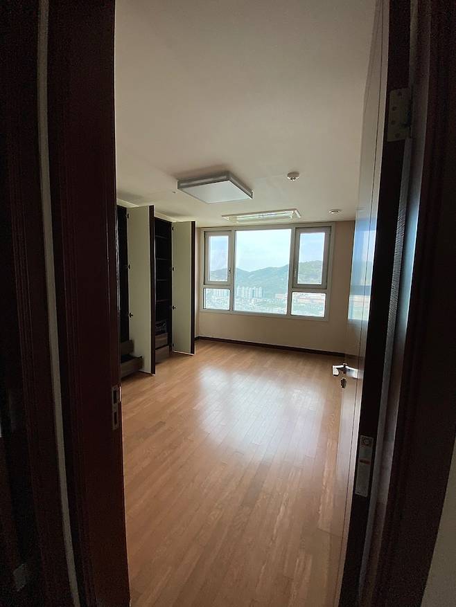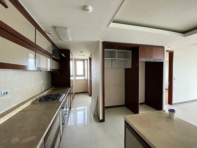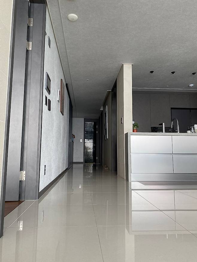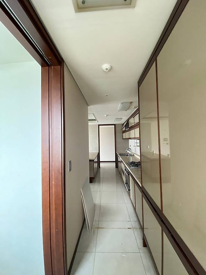안방에서 바라보는 주방 뷰 예요. 주방 천장으로 빛이 드리워진 걸 볼 수 있어요.