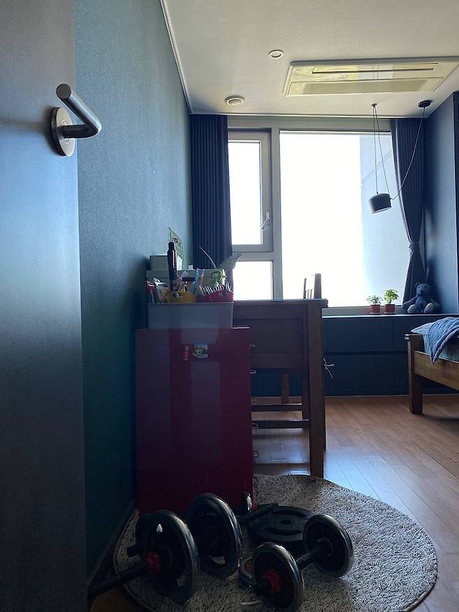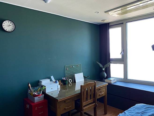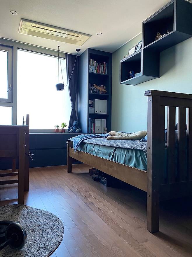 17살 아들 방은 아들이 지정해준 컬러로 벽지 마감을 했고, 딸 방보다는 작은 방으로 부족한 수납을 윈도우 시트 제작으로 수납 공간을 채웠어요. 벤치 서랍수납과 책장으로 윈도우 시트를 제작했어요. 서랍 수납에는 옷을 넣어 두었어요. 붙박이장 자재와 같이 통일감을 주었어요. 벽지는 진한 그린과 민트색으로, 천장은 일반 천장지 마감을 했어요.