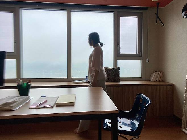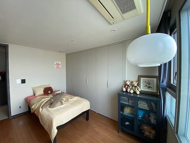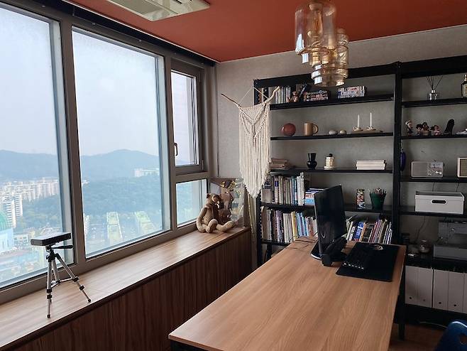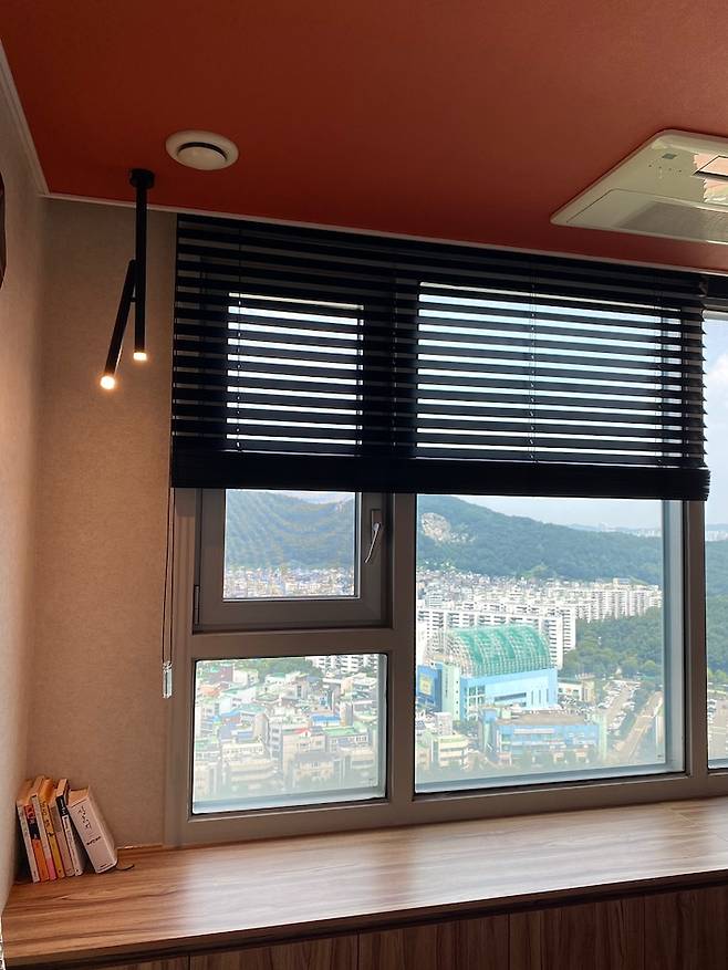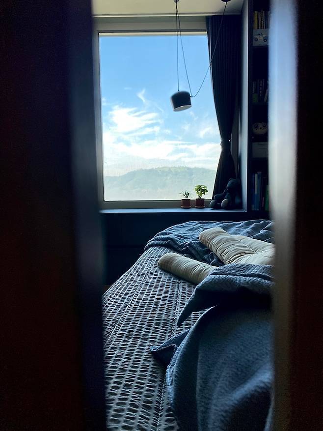 침대에 누우면 산과 하늘이 보여서 공부에 지친 아들에게 깊은 위안을 줘요. 윈도우 시트 위에 펜던트 간접 조명을 설치했는데 아들이 앉아서 책도 읽고 음악도 듣는 자리예요. 메인등 없이 3인치 다운라이트 6개를 천장에 설치해서 조도를 맞췄어요.
