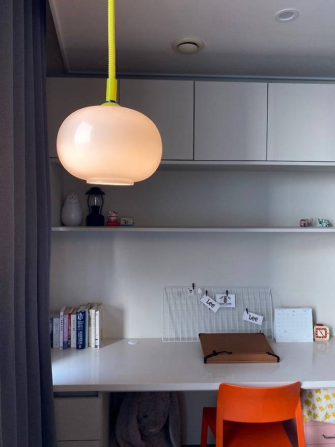메인등이 없이 3인치 다운라이트 매입등 6개를 설치하고, 포근하고 분위기 있는 펜던트 간접조명으로 방 내부를 분위기 있게 연출했어요. 사춘기 호르몬의 영향으로 잠이 많아진 아이를 위해 그레이 컬러의 암막커튼을 설치했어요.