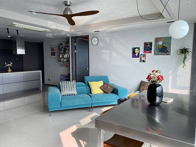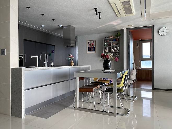 주방 복도 쪽에서 바라본 거실 창가 뷰예요. 통창으로 빛이 복도 끝까지 들어와서 집이 전혀 어둡지가 않아요. 스텐 테이블에 앉아 멍하니 앉아 있기만 해도 좋아요. 바닥 타일 컨디션이 좋아서 별도로 시공하지 않았는데 살아보니, 유광 타일이라 반사되어 안 좋고 청소할 때도 안 좋더라구요.