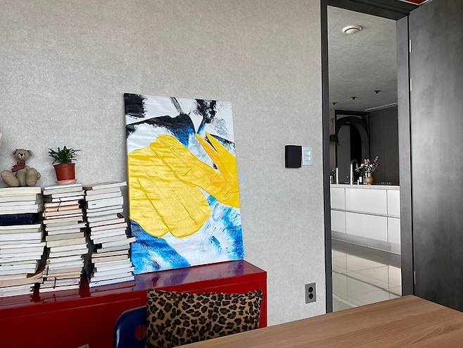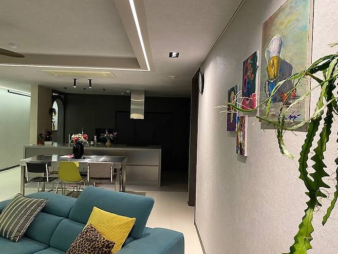 아트월 벽에 놓아준 비정형 거울에 비친 반대편 거실 뷰예요. 직접 그린 유화를 걸어두어 저만의 작은 갤러리 공간을 만들었어요.. 벽 전체가 꽉 채워질 날이 오겠죠~