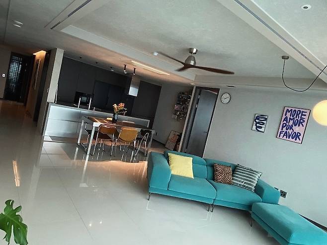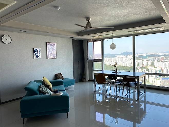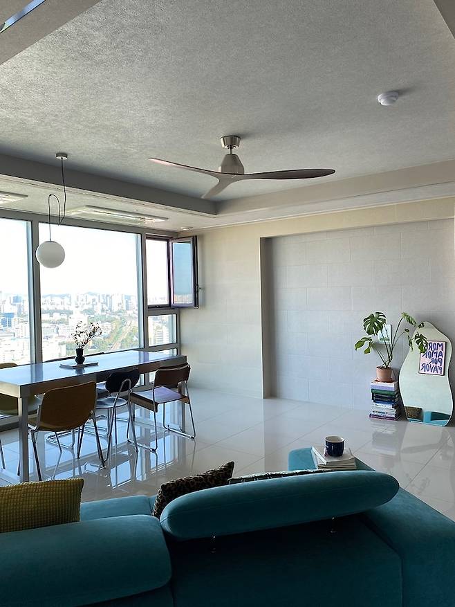 하늘 뷰, 산 뷰, 아파트 뷰, 바다 뷰, 일출 뷰까지 많은 뷰를 가지고 있는 거실이에요. 밖에 뷰를 잘 보고 느낄 수 있게 소파를 사선으로 배치해 두었어요. 고층인데 바람도 잘 불어오고 시원한 집이고 곧 가을 옷으로 갈아입을 산 뷰를 기대해봅니다.