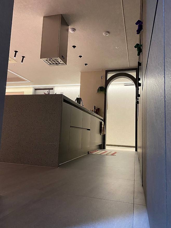 거실 아트월에서 바라보는 복도 뷰예요. 주방의 아치도 보이고 현관 간살 중문도, 우측으로 아이들 방도, 아이들 화장실이 보여요.