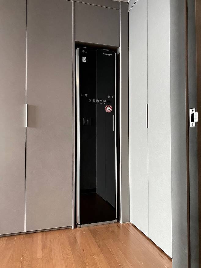 5310 길이의 붙박이장 끝에는 드레스룸 문과 경계에 에어드레서를 빌트인으로 넣었어요. 눈에 거슬림 없는 가구의 라인 정리로 가전과 맞추었어요.