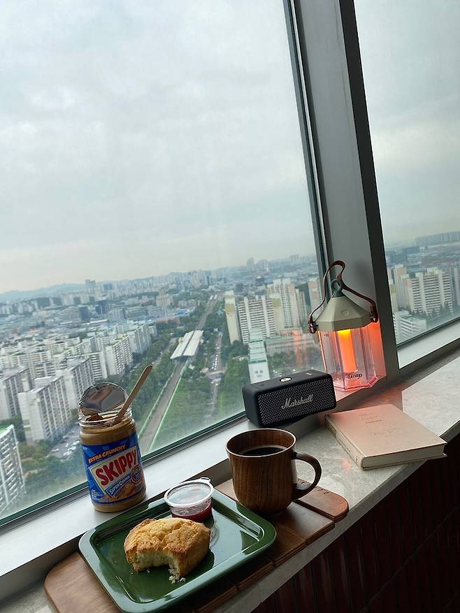 며칠 전 비가 와서 센치했던 날에 윈도우 시트에 앉아서 커피를 마시고 있는 모습이에요. 탁 트인 뷰가 매력적인 이곳은 우리 집의 포인트 공간이에요.