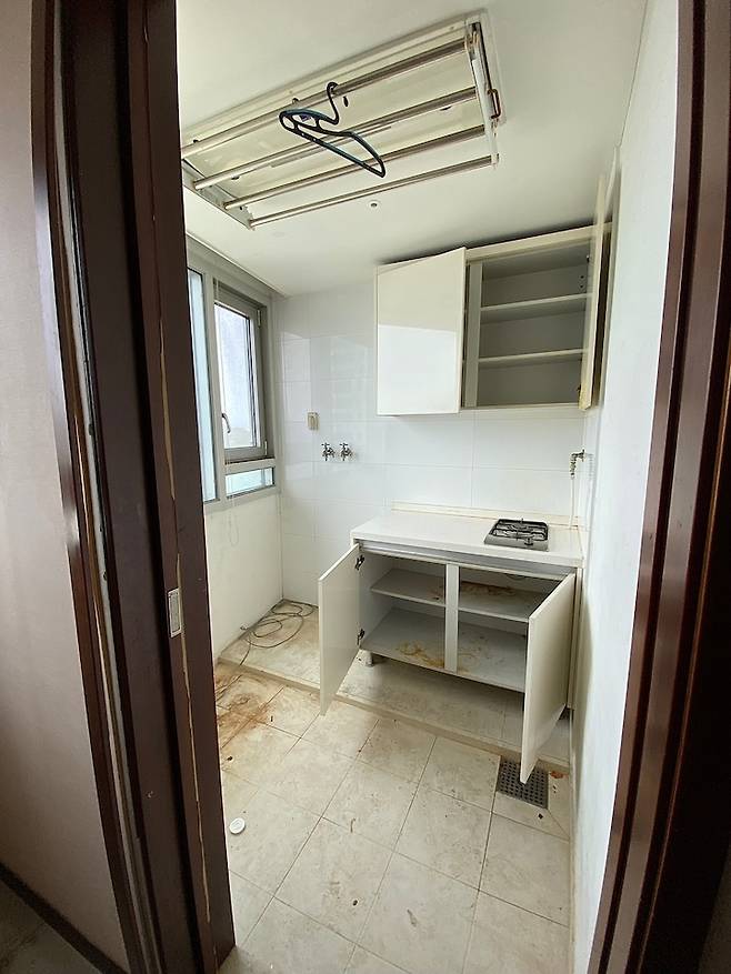 사진으로만 보셔도 엉망인 세탁실이에요. 안방 베란다 타일과 동일하게 덧방으로 카페트 타일을 시공하고 천장 자동 건조대는 철거 후 매입 간접 조명 설치, 탄성코트, 세탁기, 건조기 가전을 빌트인하고 수납을 가구 제작하기로 했어요. 세탁실문을 슬라이딩으로 필름지 시공했어요.