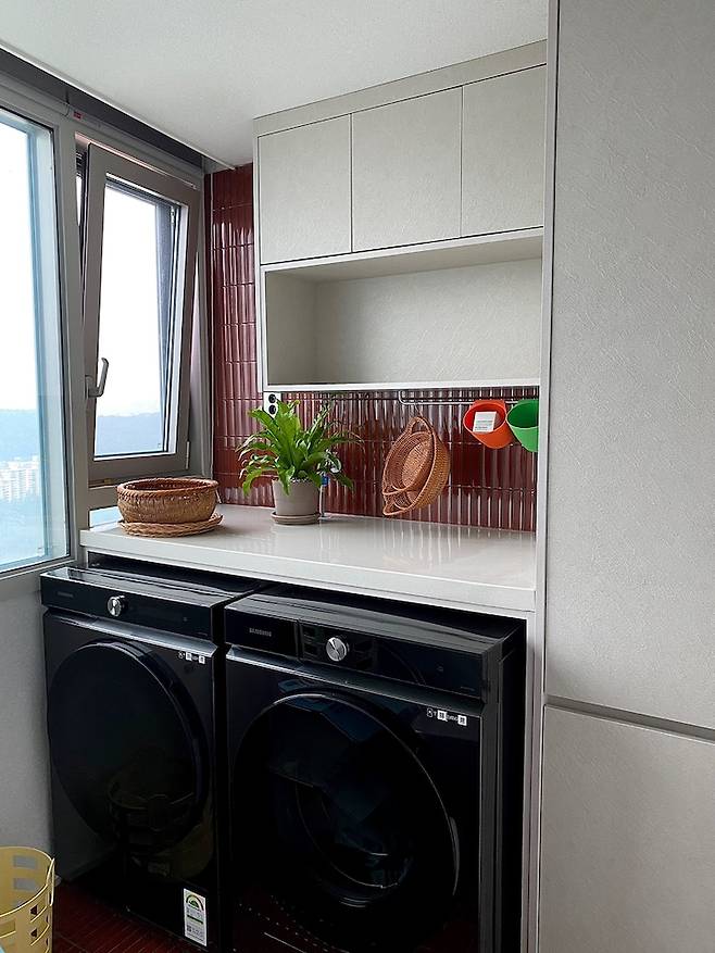 주방 창가에 수납장이 없었는데 쌀통과 로봇 청소기 자리에 가구를 제작했어요. 문학산 뷰라서 창문을 열면 시원한 바람이 불어와 요리를 할 때 덥지도 않아요.