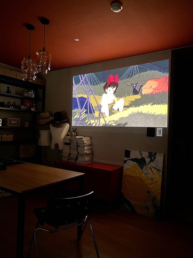 거실에서도 빔으로 영화를 보지만, 윈도우 시트에 앉아 벽에 기대어 보는 것 또한 너무 좋아해요. 따로 조명을 켜지 않아도 야경만으로 간접 조명이 되어요. '마녀배달부 키키'를 좋아해서 10번은 넘게 봤어요.