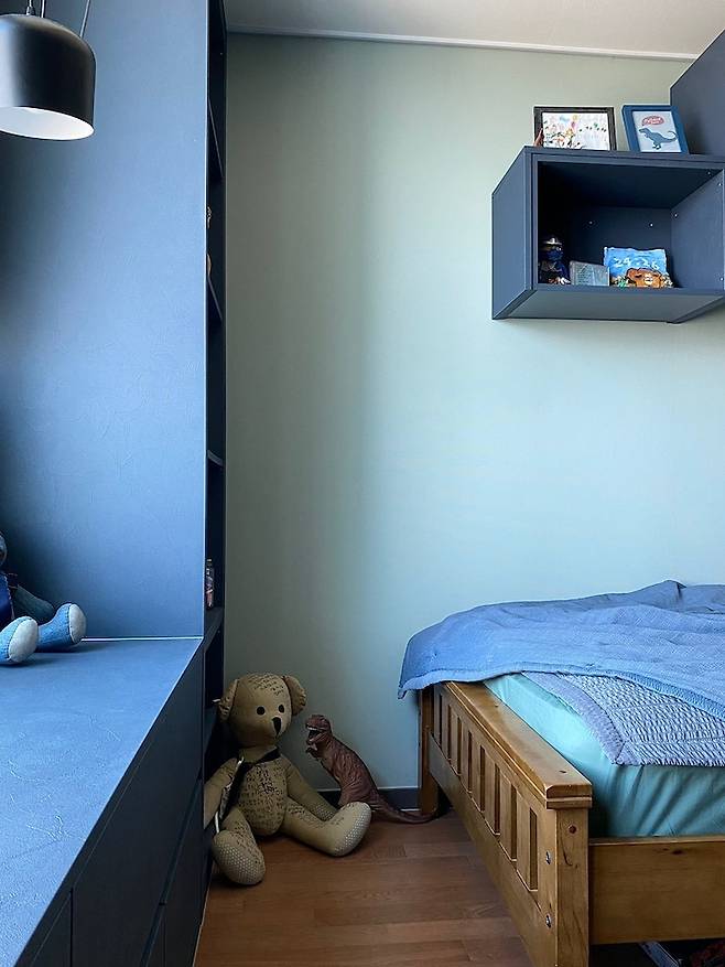 남자 아이방답게 그린과 블루 조합으로 연출했어요. 붙박이장 문은 교체를 하고 스텐 손잡이로 세련미를 더해 주었어요.