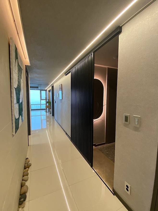 조명 거울에 비친 간살이 멋스러워요.. 간살 중문 너로 보이는 복도는 라인 조명으로 은은하게 간살 중문과 액자를 비쳐줘요..