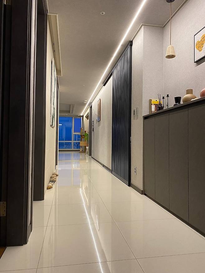 복도에는 길게 라인조명으로 집을 더 커보이게, 길게 연출했어요. T5 라인 조명으로 주백색으로 조도를 맞췄어요.