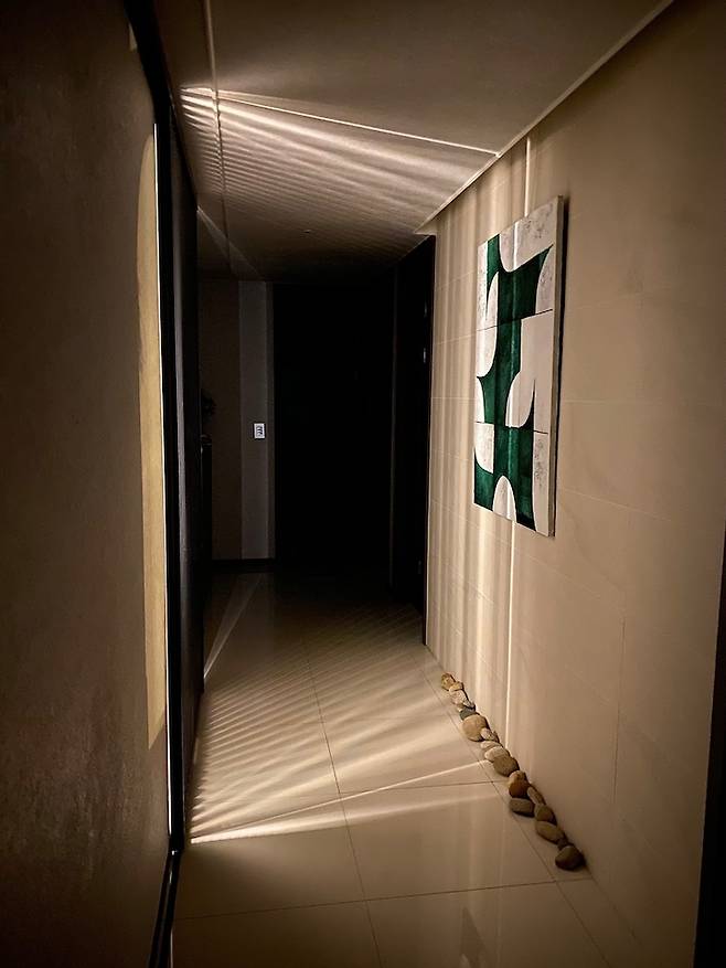 부드럽게 닫히는 간살 문을 닫고 들어오면 은은한 조명이 갈래 나누어져 현관 복도에 포인트를 줘요.