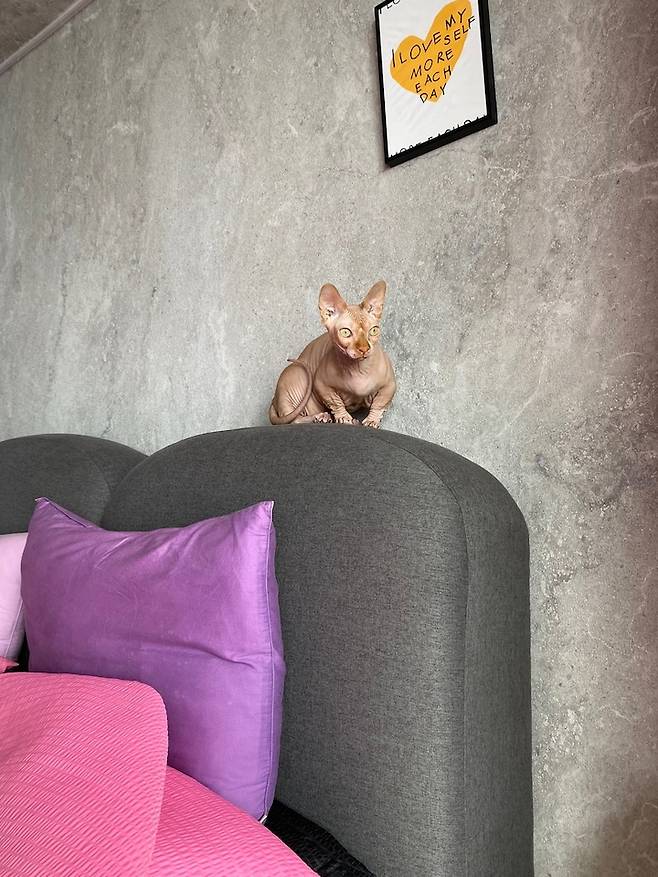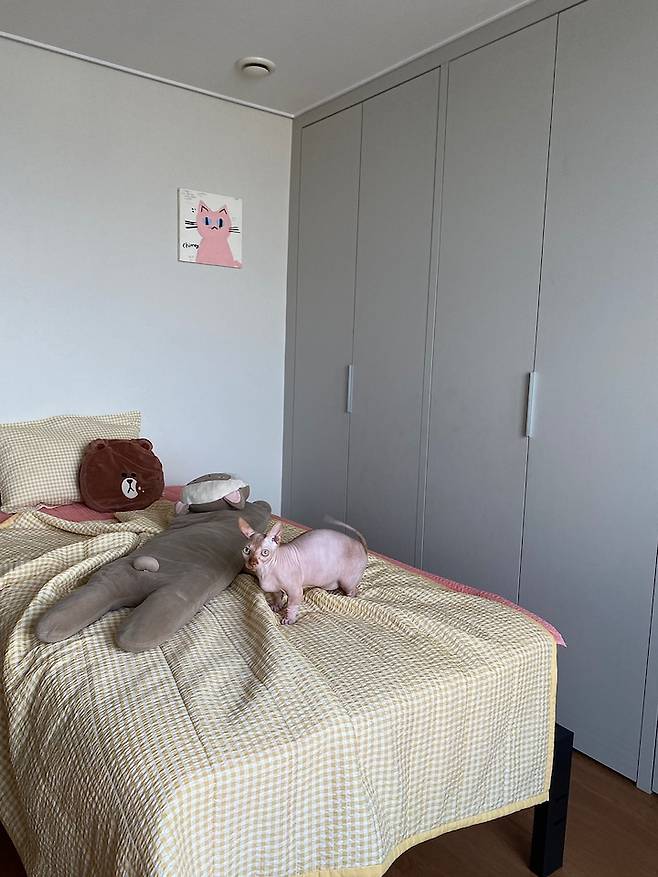 벽지에 스톤의 무늬가 있다보니 큰 액자보다는 작은 액자를 두었어요. 울 막둥이는 침대 헤드에 올라 창밖을 보며 일광욕을 즐겨요.