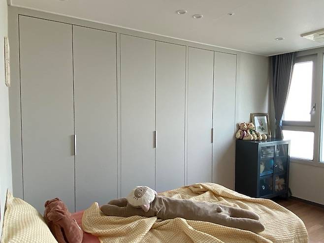 안방 침실 공간은 우리 부부가 편안하게 쉴 수 있는 수면 공간으로 다른 군더더기 없이 붙박이장은 벽처럼 보이고 침대 하나만 놓인 공간처럼 최소한의 가구로 다른 장식 없이 하고 싶었어요. 붙박이장 길이가 5310으로 긴 벽처럼 보여요. 방을 예쁘게 꾸미는 것도 중요하지만 가장 중요한 부분이 내가 쓰기 편해야 한다고 생각해요.