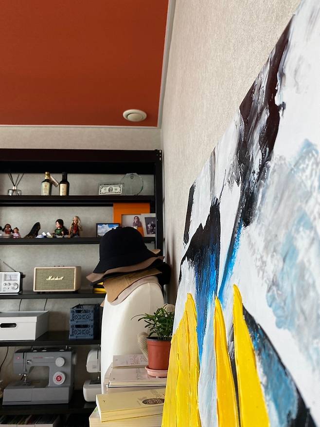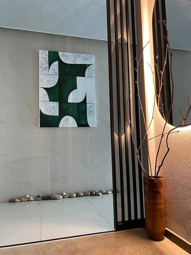 크리스마스가 다가오면 크리스마스 데코볼로 나무 가지에 트리처럼 장식하려고 해요. 간살 슬라이딩 도어를 열었을 때 보이는 그림은 직접 그린 추상 유화를 사서 캔버스에 타커를 이용해 액자를 만들었어요. 셀인 카페에서 정보를 얻고, 알리 익스프레스에서 구매를 해서 가성비 좋은 핸드메이드 유화 작품을 걸어 갤러리 같은 공간으로 만들었어요.