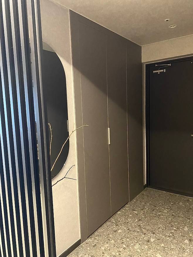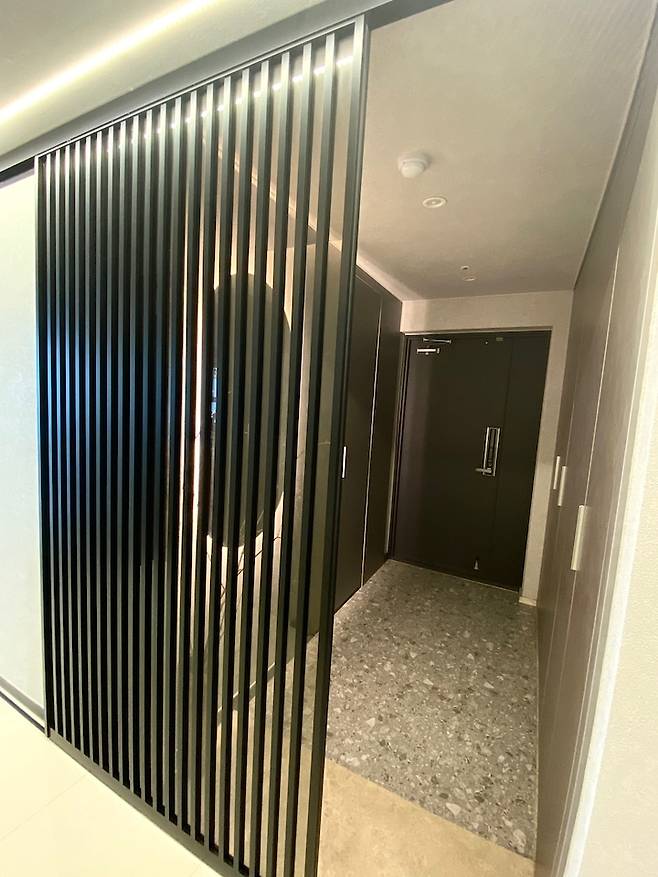 간살 중문에서 바라본 현관문이에요. 오른쪽은 신발장, 왼쪽은 숨겨진 팬트리장이에요. 바닥 테라조 타일까지 다크 그레이여서 중문과 현관문을 그레이로 하지 않고 블랙으로 매칭했어요. 현관문은 신발장 스톤 느낌 살려 터치 블랙으로 필름 지 마감을 했어요.. 현관 또한 벽지를 LX 하우시스 디아망 회벽 라이트 그레이로 천장까지 시공했어요.
