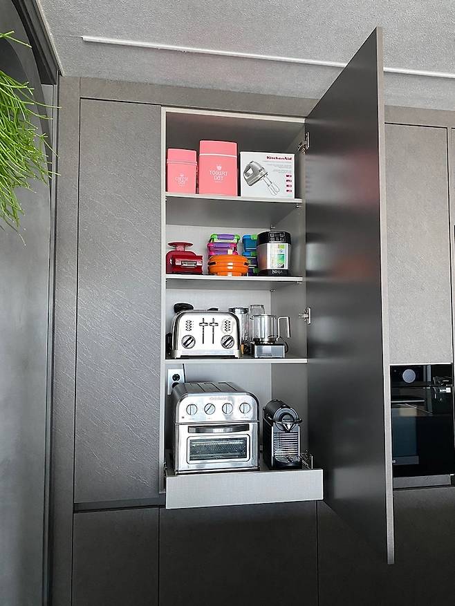오븐 옆 키큰장에는 가전을 수납하고 있어요. 에어프라이기, 토스터기, 커피 머신, 우유 거품기, 믹서기, 와플기, 샌드위치메이커, 키친 에이드 반죽기 등 여러 가전을 수납하고 수납 레일을 설치하고 수납장에 콘센트 작업을 해서 제품을 이용하는데 편리하게 가구 제작을 했어요. 분배기는 오븐 아래 하단에 감추었어요.