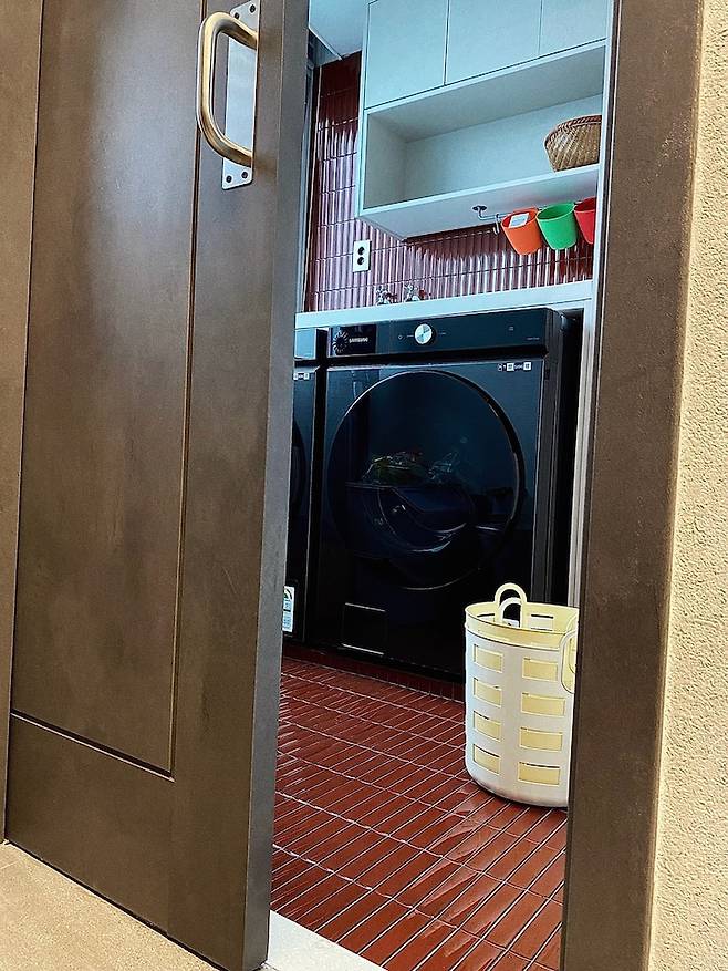 세탁기 건조기 가전을 빌트인으로 가구 제작을 해서 깔끔한 가구의 선들을 맞추고 수납 공간을 확보했어요. 세탁, 건조기 앞 공간은 분리수거함과 청소기를 두었어요. 세탁실은 깨끗함을 느낄 수 있게 아이보리 컬러 포인트를 주었어요.