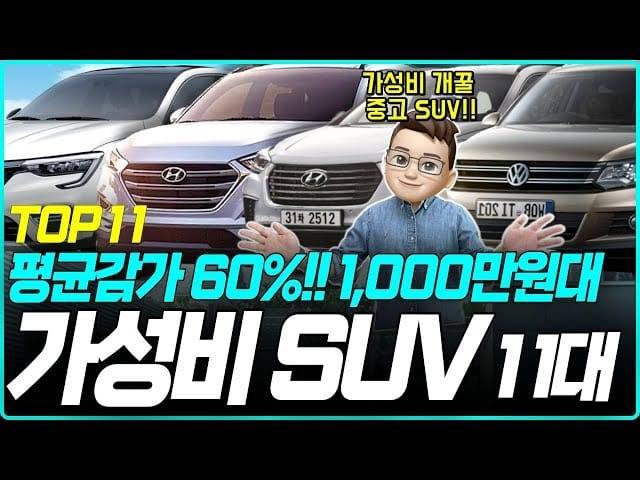 중고차 전문가들이 추천하는 1000만원대 가성비 SUV로는 2015~2017년식 기아 쏘렌토R, 2014~2016년식 스포티지R, 2013~2015년식 현대 싼타페 DM 등이 꼽힌다. 이들 차량은 출시 당시 신차 가격이 3500만원에서 8000만원대를 형성했지만, 현재 평균 감가율이 60~80%에 달하며 1000~1500만원대에 구매할 수 있다.