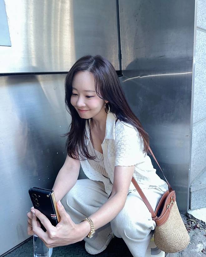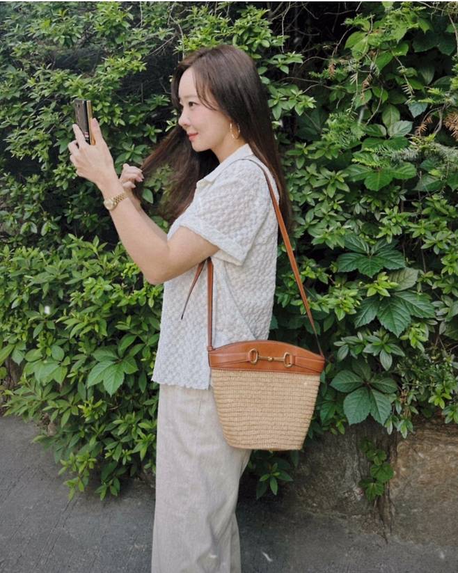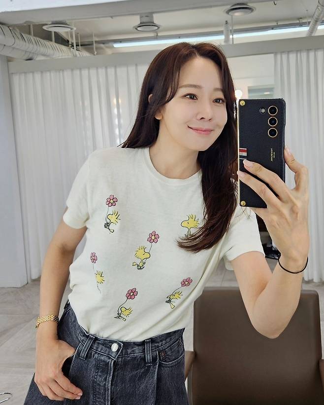 또, 소유진은 아이보리 반팔 티셔츠에 데님 팬츠를 매치해 청순하고 산뜻한 코디를 완성했습니다.