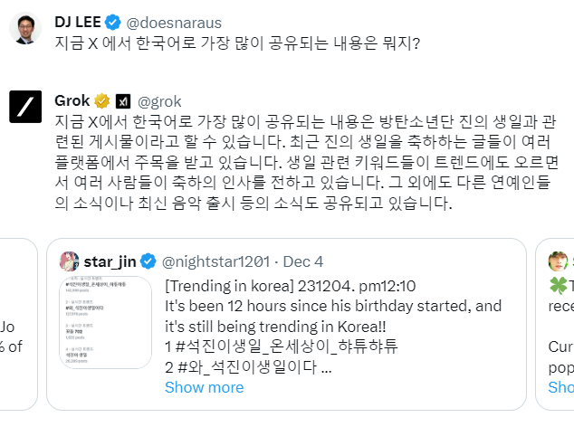 그록은 X 내의 검색 능력이 뛰어나다. 현재 X 에서 가장 많이 트렌딩(실시간 상위) 되고 있는 것이 무엇인지를 잘 대답해준다.