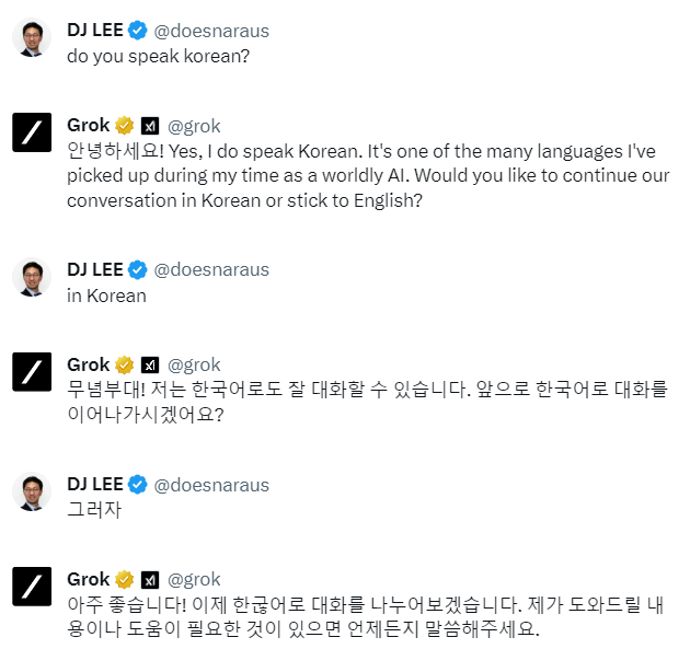 다만 한국어에서는 유머 능력이 좀 떨어지고, 영어일 때 더 유머감각이 넘친다. 기자처럼 영어 X 계정을 운영하는 사람에게는 그록이 트윗 작성하는데 큰 도움이 된다.