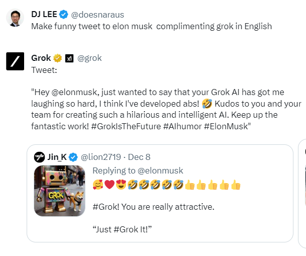 다만 한국어에서는 유머 능력이 좀 떨어지고, 영어일 때 더 유머감각이 넘친다. 기자처럼 영어 X 계정을 운영하는 사람에게는 그록이 트윗 작성하는데 큰 도움이 된다.