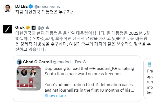 대한민국의 지금 대통령이 누군가를 묻는 질문도 정확하게 대답했다. 이처럼 X 내에서 검색을 해서 답할 경우 근거가 되는 트윗을 인용해주는 것이 인상적이다.