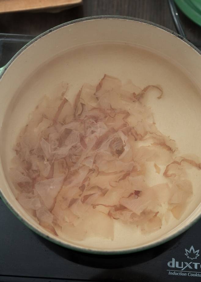 1. 냄비에 물 8컵과 다시마를 넣고 끓이다가 끓기 시작하면 다시마를 건져낸다. 불을 끄고 가쓰오부시를 넣어 5분간 우린 뒤 체에 밭친다.