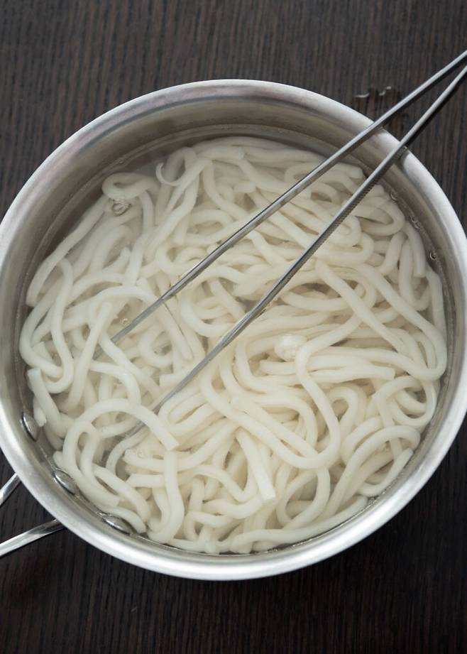 3. 다른 냄비에 끓는 물을 준비해 우동면을 데친다. 면이 풀리면 체에 건져둔다.