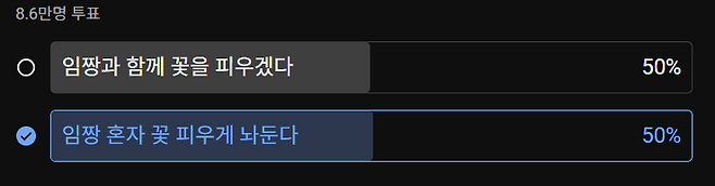 이와 함께 '임짱과 함께 꽃을 피우겠다'(찬성), '임짱 혼자 꽃 피우게 놔둔다'(반대)로 나눠 투포를 진행했다. 이 투표에는 3시간 만에 무려 9만 명이 참여했으나 찬성이 50%, 반대가 50%로 의견이 극명히 갈렸다.