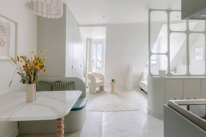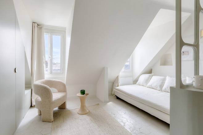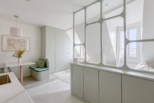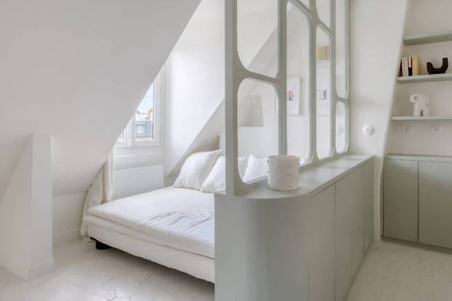 침실에는 낮에는 소파, 밤에는 침대로 변신하는 소파베드를 두어 공간 활용도를 높였습니다. 손님이 와도 부담 없이 앉을 수 있고, 사선 벽면과 화이트·민트 컬러 조합이 아늑하고 부드러운 분위기를 만듭니다. 여기에 프레임 있는 유리 가벽이 공간에 세련된 포인트를 줍니다.