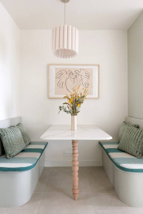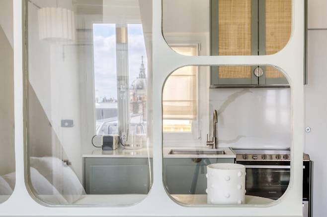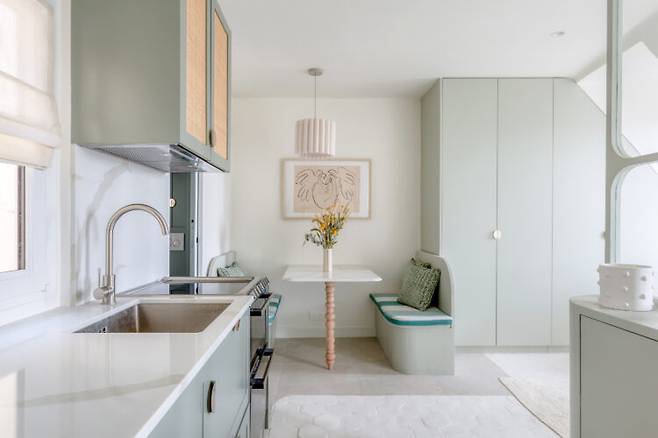 유리 가벽으로 분리된 주방은 벽 고정 선반과 벤치를 마주 보게 배치해 아늑한 다이닝룸으로 변신했습니다. 파란색 줄무늬 쿠션으로 포인트를 더해 활기찬 분위기를 완성했죠. 작은 공간에도 충분히 활용 가능한 맞춤형 테이블 설계로 ‘작지만 제대로 된 식사 공간’을 구현했습니다.