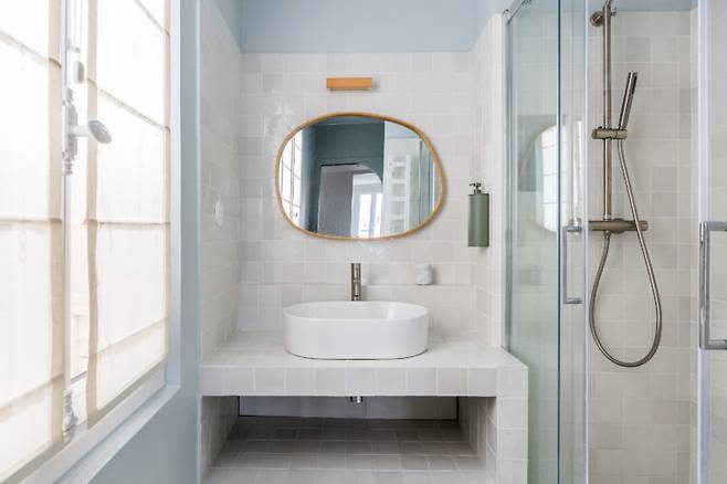 욕실은 포켓도어를 설치해 문 여닫는 공간을 줄였고, 입구 모서리를 곡선 처리해 부드러운 인상을 줍니다. 비정형 거울, 타원형 탑볼 세면대, 통일된 타일과 하부 선반으로 시각적인 연결감을 만들었죠. 작은 평수에서도 세련됨과 실용성을 동시에 잡은 디테일입니다.