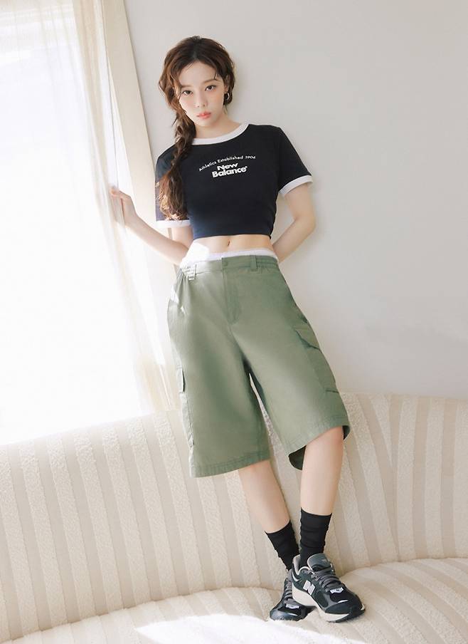 그룹 에스파의 윈터가 쇼츠와 반팔 티셔츠로 스타일리시한 캠퍼스 여름 핏을 완성했다.