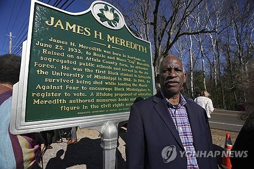 Huntsville, Ala., city council president John Meredith, son of James Meredith, who became the first Black student to enroll at the University of Mississippi in 1962, stands before the Mississippi Department of Archives and History marker recognizing Meredith's birthplace and his legacy, Friday, Dec. 20, 2024, in Kosciusko, Miss. (AP Photo/Rogelio V. Solis)