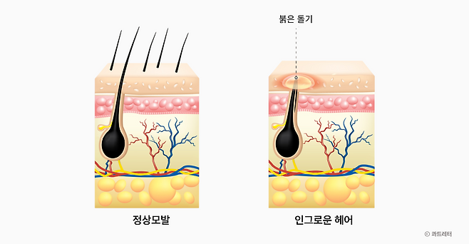 제모 후 깨끗한 피부 위에 오돌토돌한 트러블이 올라온 적 있나요? 바로 ‘인그로운 헤어’입니다. 이는 털이 피부 표면을뚫지 못하고 각질층 아래에 갇히면서 피부 속으로 파고드는 현상입니다. 털이 자라는 방향과 반대로 제모했거나, 보습과 각질 제거가 부족했거나, 피부 타입 자체가 곱슬털일 경우에 더 잘 생깁니다. 핀셋으로 털을 뽑다가 제대로 제거되지 않아 중간에 끊긴 털이 피부 안에 남는 경우도 있어요.