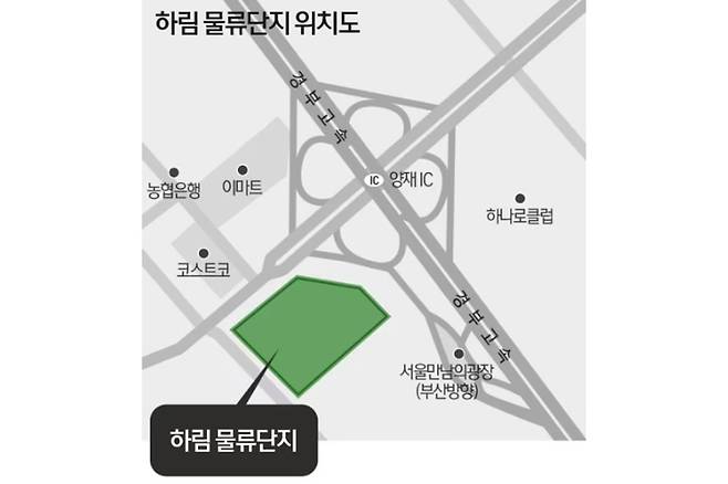 문제의 도로는 과거 화물터미널 부지였던 곳으로, 서초구 양재 나들목(IC) 인근에 있어 ‘노른자위 땅’으로 불린다. 이 땅의 전체 면적은 9만 6017㎡에 달한다. 원래 이 땅은 2006년 시행사 파이시티가 유통 업무시설로 개발할 예정이었지만, 2014년 파산하면서 개발이 중단됐다. 이후, 이 땅은 여러 차례 유찰된 끝에 2016년 하림그룹이 공매를 통해 최저입찰가(9,864억 원)의 절반에도 못 미치는 4,524억 원에 매입했다.