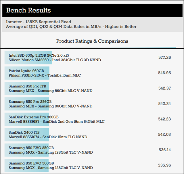 그 중 2015년에 출시했던 SSD들과 요즘 SSD의 성능 격차가 가장 큰 것은 순차 읽기/쓰기 성능이다. 2015년에는 대부분이 SATA SSD였기 때문에 500MB/s의 벽을 넘기 어려웠다. 2015년 하반기에 나온 삼성전자 950 Pro(NVMe)라던지, 또는 PCI Express 슬롯에 꽂는 특수한 SSD 제품을 제외하면 모두들 500MB/s로 대동소이하다. 그 당시 잘나가던 OCZ 벡터, 마이크론 크루셜 MX200, 삼성전자 850 시리즈 등등 대부분 그렇다.