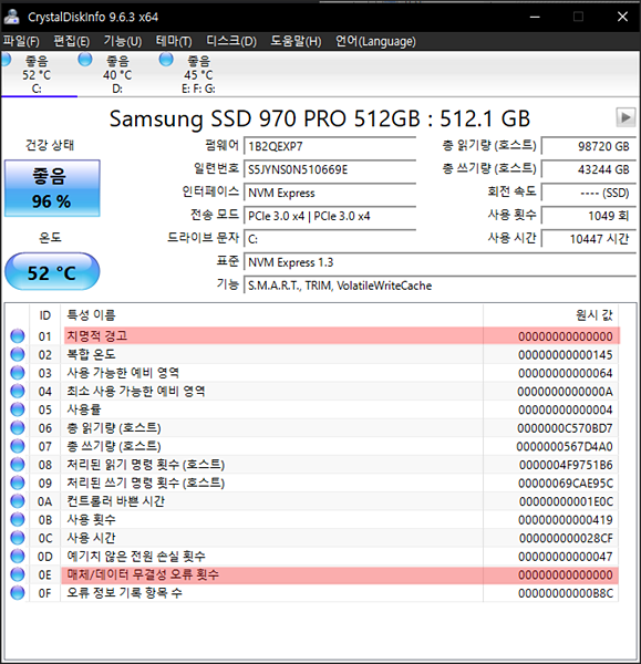 상태 점검에서 치명적인 오류 발생 횟수가 잡힌다면 교체 준비해야