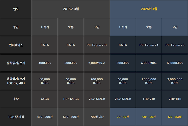 하지만 2025년은 많은 것이 달라졌다. 10년 전과 비교하면 우선 1GB 당 가격이 압도적으로 저렴하다.