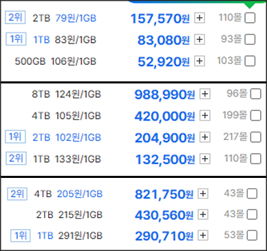 2025년 SSD 단가는 보급형이 1GB에 70~80원 대, 중급형은 1GB에 90~130원 대, 고급형은 1GB에 170~240원 대로 나온다. 10년 전에는 512GB SSD를 30만 원 주고 샀는데, 요즘은 512GB SSD를 몇 만원이면 살 수 있고 특가로는 3만 원 이내로도 살 수 있다는 걸 생각해 보면, 1GB 당 가격이 대략 1/6. 최대 1/10까지 저렴해졌다.