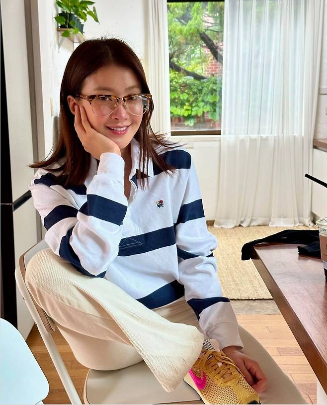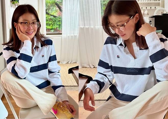 이시영은 화이트에 네이비 스트라이프 패턴이 들어간 카라 티셔츠를 착용해 캐주얼하면서도 스타일리시한 패션을 선보였습니다.